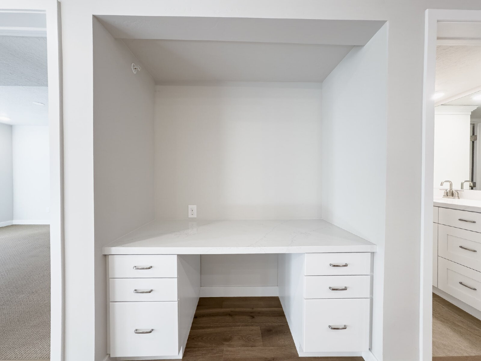The kitchen is designed to impress with stainless steel appliances, stunning quartz countertops, a large kitchen island perfect for cooking or entertaining, abundant cabinet storage, and a spacious pantry. Just off the kitchen you will also find a convenient built-in desk area, ideal for a home office or study space.